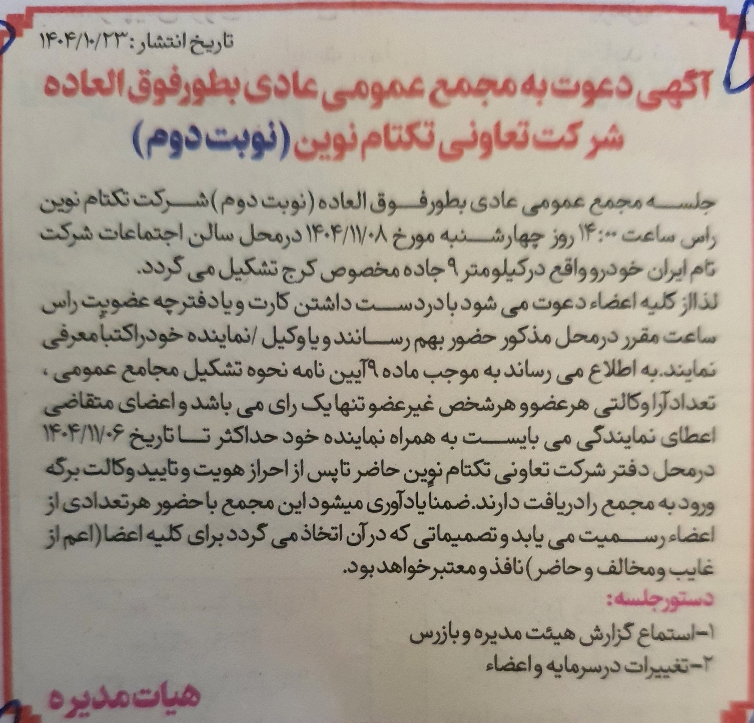 جلسه مجمع عمومی عادی بطور فوقالعاده (نوبت دوم) شرکت تکتام نوین رأس ساعت 14:00 روز چهارشنبه مورخ 1404/11/08 در محل سالن اجتماعات شرکت تام ایران خودرو واقع در کیلومتر 9 جاده مخصوص کرج تشکیل میگردد. لذا از کلیه اعضاء دعوت میشود با در دست داشتن کارت و یا دفترچه عضویت، رأس ساعت مقرر در محل مذکور حضور بههم رسانید و یا وکیل/نماینده خود را کتبا معرفی نمایند.